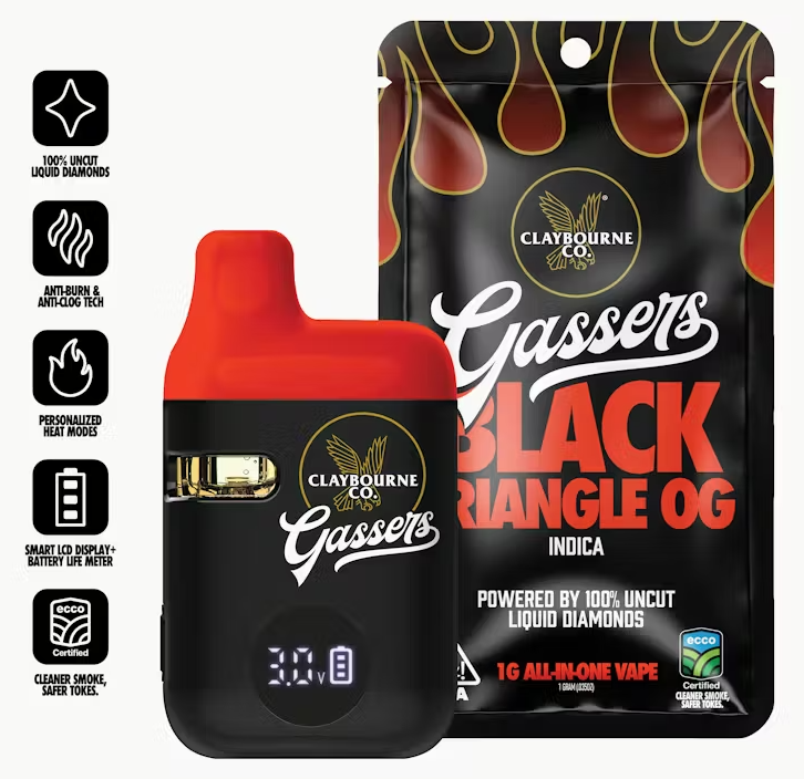 The Claybourne Gassers All In One 1g Black Triangle OG delivers an exceptional vaping experience with premium liquid diamonds and natural terpenes, averaging 90-92% total THC. This innovative device features nothing cut and nothing diluted, ensuring pure potency with every draw.
