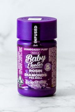 Indulge in MMD Shops Hollywood's Baby Jeeters Infused 5pk prerolls- a top-tier, cannabis-infused release that packs a punch. Each pack contains five, 0.5g Grandaddy Purple prerolls, totaling a substantial 2.5g. Praised for their substantial 44.25% THC content and grown indoors for optimal quality, these powerful prerolls infuse the aromatic strain Grandaddy Purple with potent Distillate Oil and Kief.
