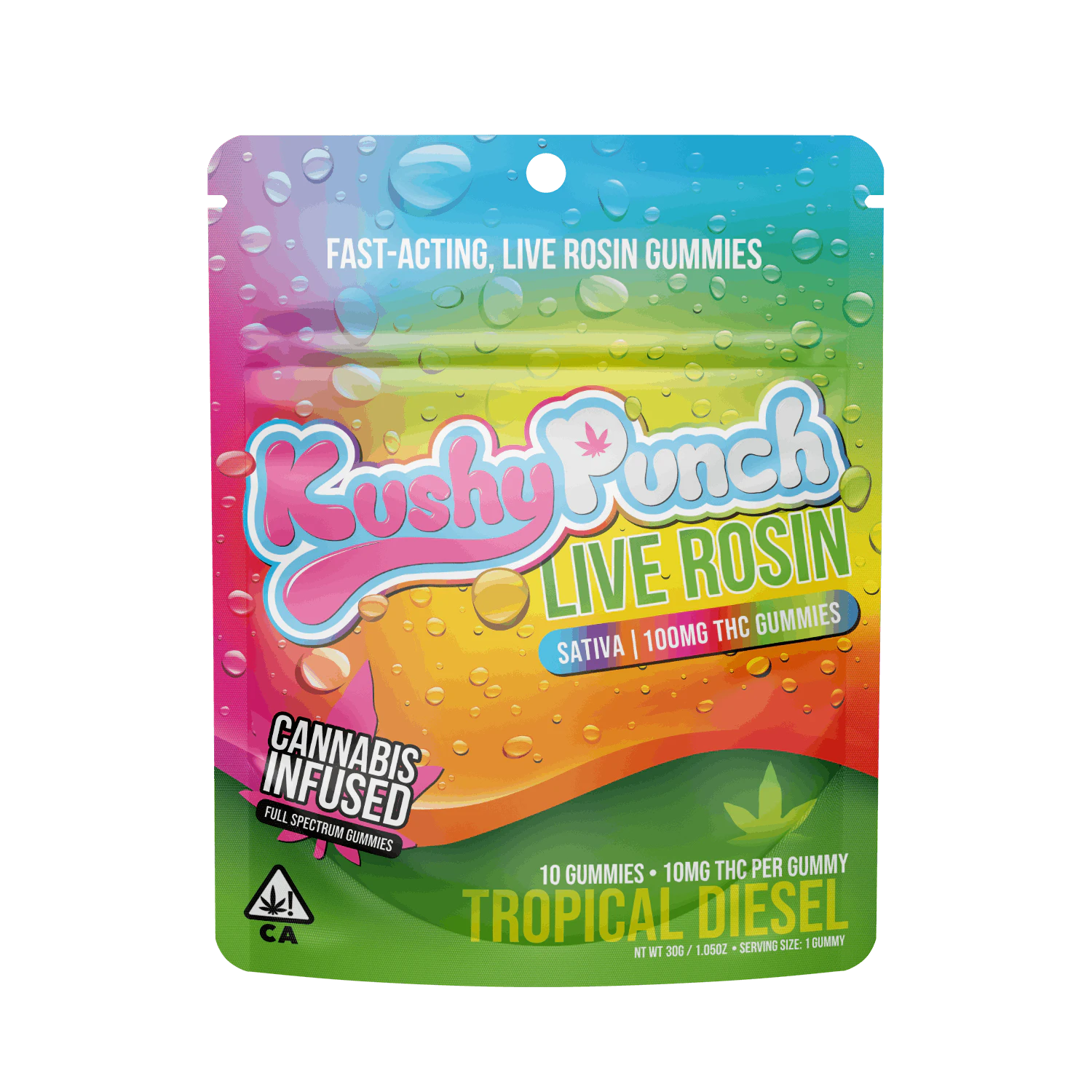 Experience a tropical escape with every bite of Kushy Punch Live Rosin 10pk Gummies in Tropical Diesel. These premium cannabis edibles combine exotic fruit flavors with an invigorating diesel finish, delivering a uniquely satisfying taste experience. Crafted with high-quality live rosin, these gummies provide an authentic full-spectrum cannabis experience that captures the complete essence of the plant's natural profile.