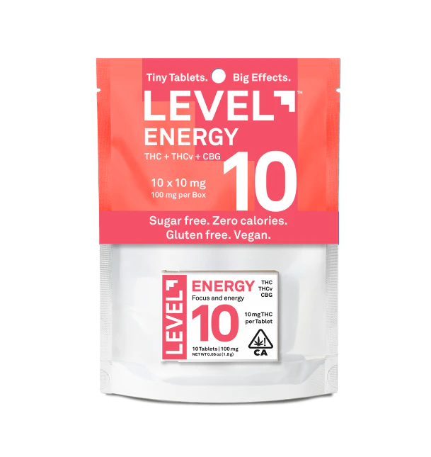 Experience clean, sustained energy with Level10 10pk Energy THCV:CBG tablets from MMD Shops Hollywood. These innovative sugar-free tablets deliver a precisely formulated blend of 10mg delta-9 THC, 5mg THCV, and 3mg CBG designed to provide focused energy without the crash associated with traditional edibles.