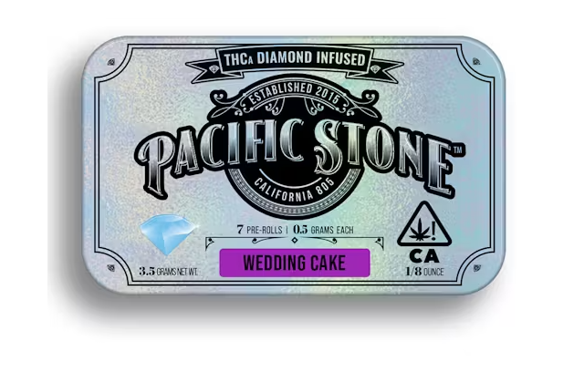 Pacific Stone Diamond Infused 7pk Prerolls featuring Wedding Cake deliver an extraordinary cannabis experience that combines premium craftsmanship with unmatched potency. This exceptional indica-hybrid, a masterful blend of Triangle Kush and Animal Mints, has earned its reputation as a top-5 selling strain since 2019, captivating enthusiasts with its sweet, creamy flavor profile that lives up to its dessert-inspired name.