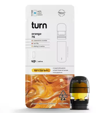 Turn's 100% live resin extraction process captures the essence of fresh-frozen cannabis plants that are never dried, preserving the natural terpenes and compounds for an authentic, floaty entourage effect. Orange 76 combines the nostalgic sweetness of orange creamsicle with uplifting effects that groove perfectly with your active lifestyle. Whether you're looking to pump up the jams or learn a new trick, this convenient 1-gram pod delivers consistent, potent hits that shimmy you into dreamy new heights.