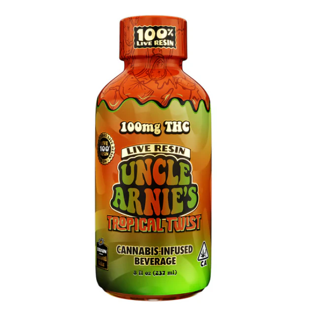 Experience the extraordinary with Uncle Arnie's Live Resin Tropical Twist, a premium 100mg cannabis-infused beverage available exclusively at MMD Shops Hollywood. This sophisticated concoction transcends ordinary tropical punch, delivering an exotic fusion of sun-ripened papaya and zesty lime that dances on your palate with every sip.