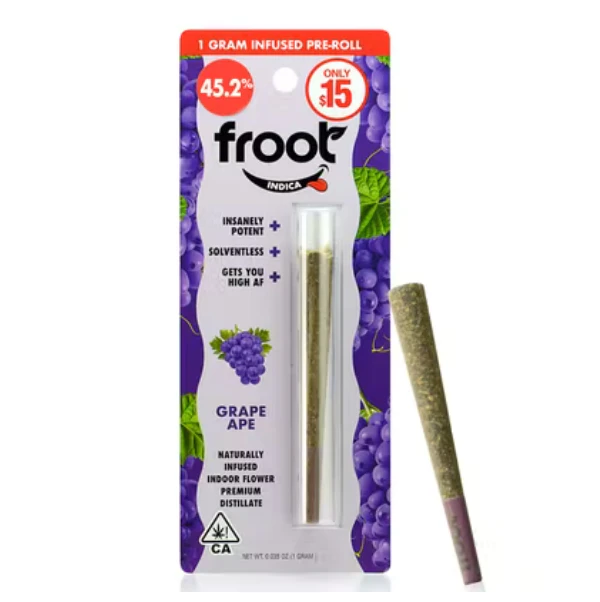 Experience pure relaxation with Froot Preroll 1g Grape Ape, a meticulously crafted premium offering available at MMD Shops Long Beach. This exceptional preroll features a harmonious blend of Mendocino Purps, Skunk, and an exclusive Afghani landrace strain, masterfully created by renowned cultivator Bret Bogue of Apothecary Genetics.