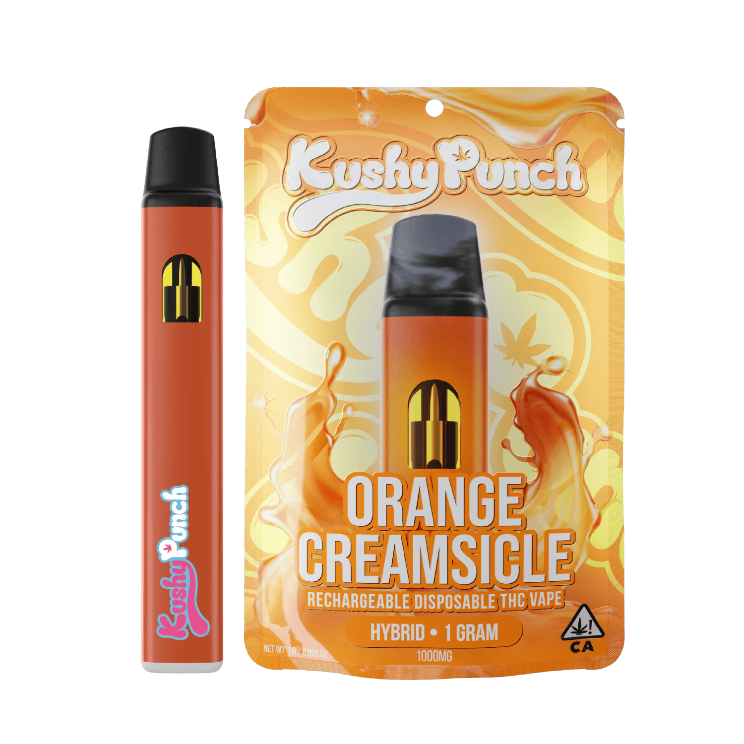 Experience the delicious taste of Orange Creamsicle with the Kushy Punch All In One 1g disposable vape, now available at MMD Shops Long Beach. This premium cannabis vape delivers one full gram of all-natural, great-tasting flavor that captures the essence of the classic creamy orange treat you love.