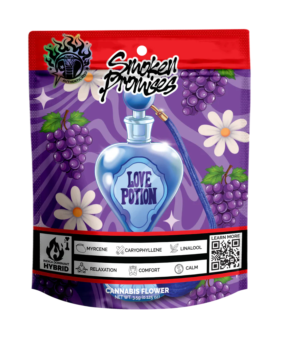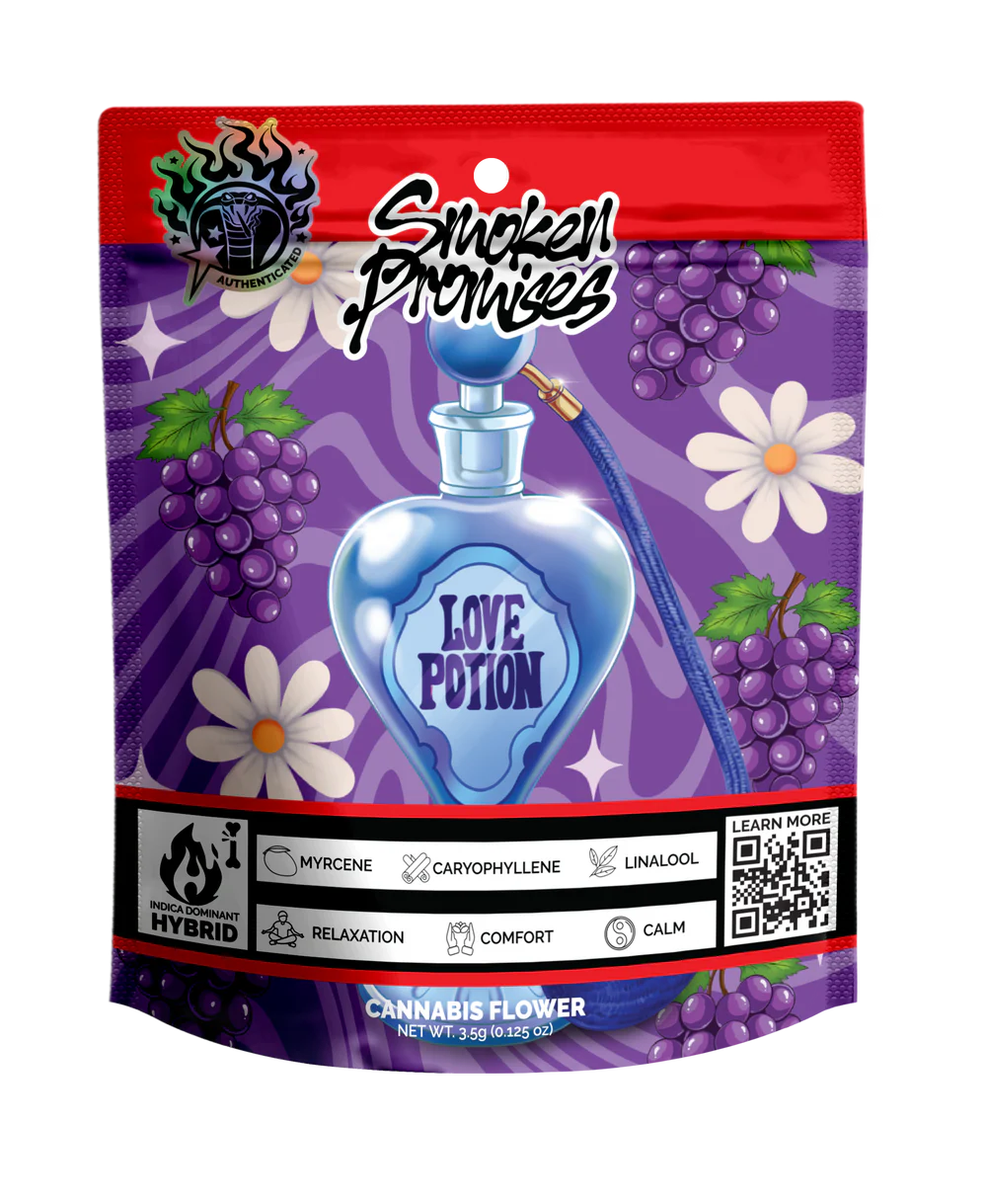 Experience the captivating magic of Smoken Promises' Love Potion, a premium 3.5g indica-dominant hybrid that promises to enchant your senses and elevate your cannabis journey. This spellbinding strain delivers rich, velvety grape flavors that dance across your palate with each smooth inhale, creating an unforgettable smoking experience that will leave you completely mesmerized.