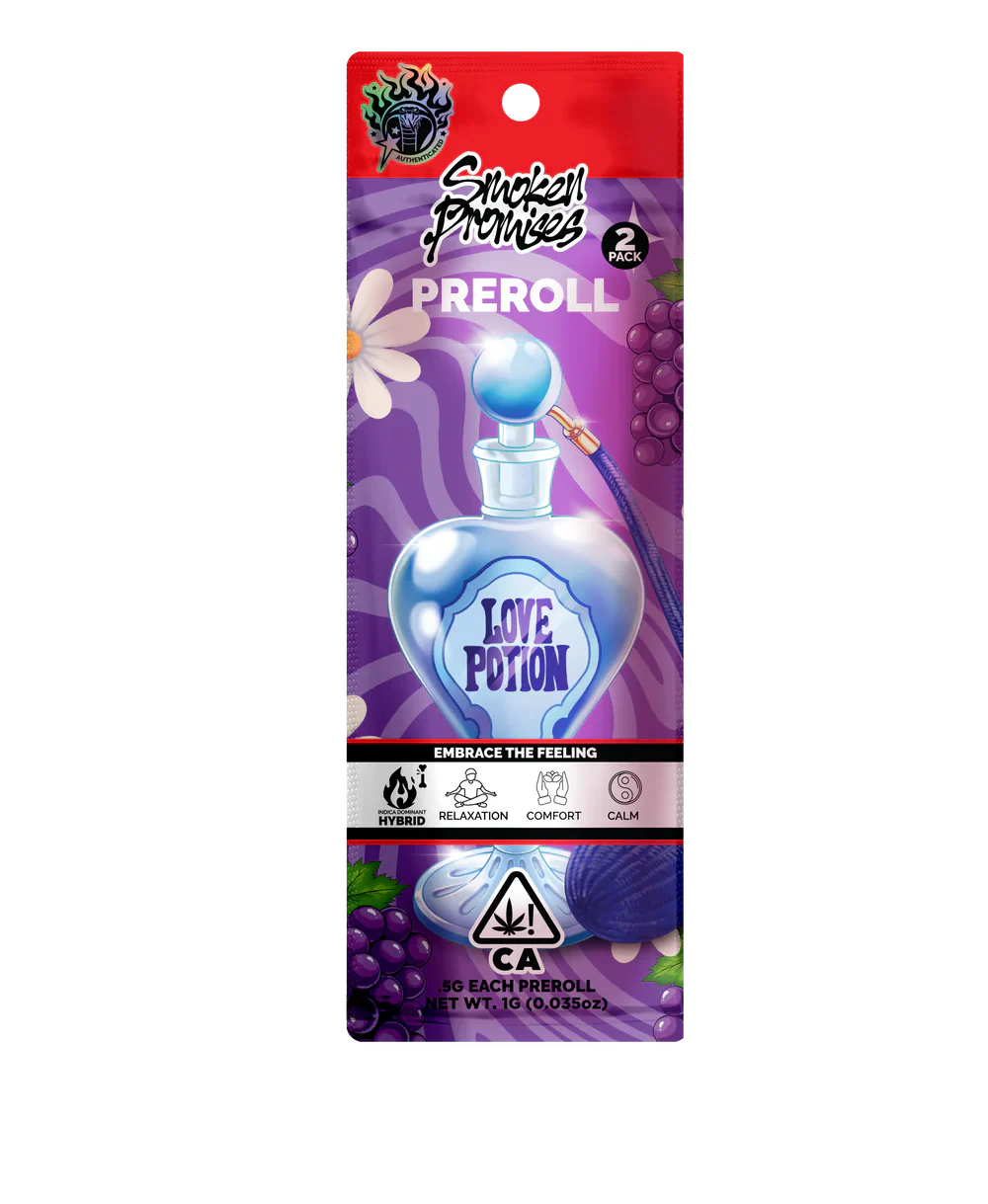Discover the enchanting effects of Smoken Promises 2pk Prerolls 1g Love Potion, now available at MMD Shops Long Beach. This carefully crafted two-pack delivers premium cannabis convenience in perfectly rolled joints, each containing 0.5 grams of high-quality flower for a total of 1 gram per package.