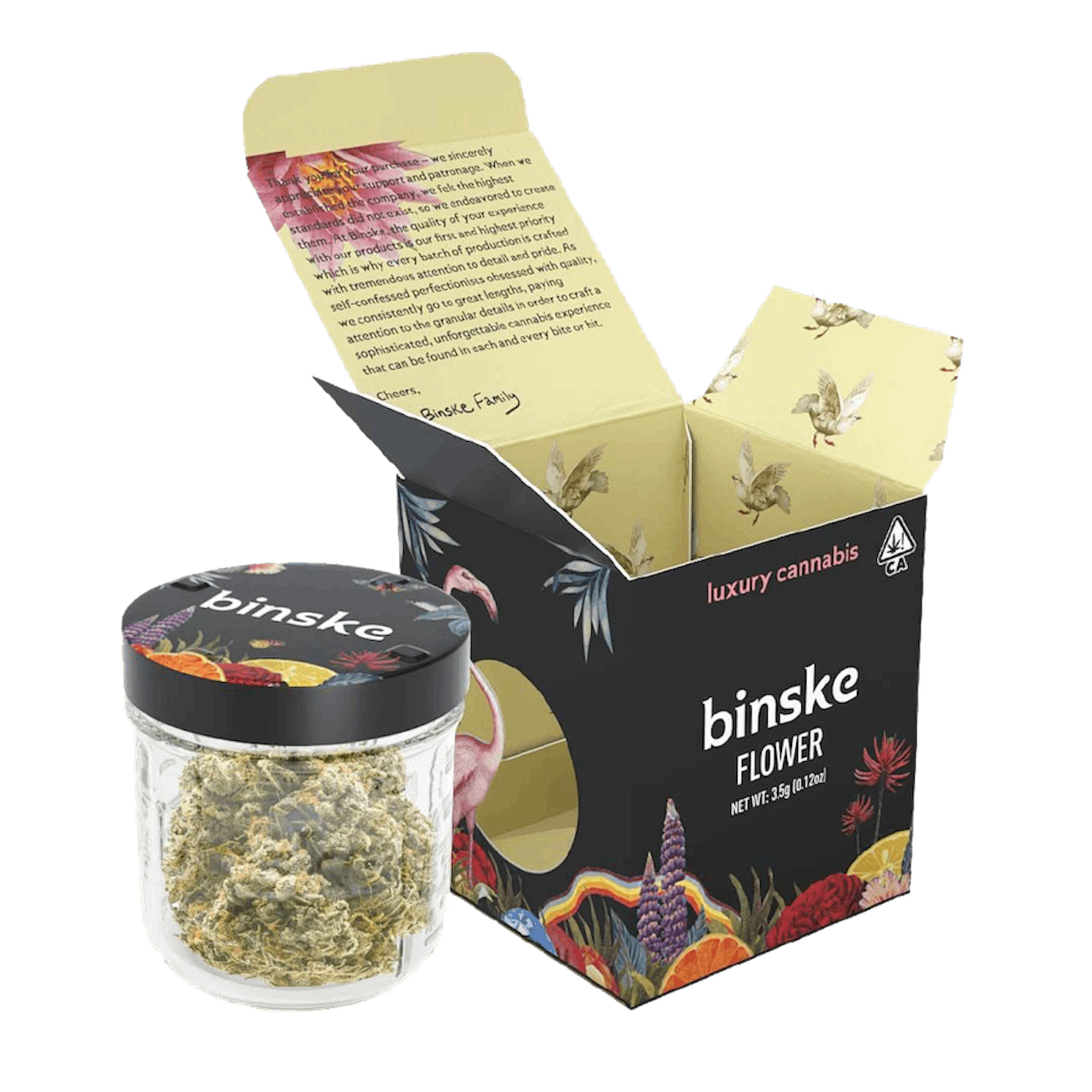 We take pride in carefully selecting our strains so we can deliver the best flavor profile possible. We are driven to make the best-tasting and highest-quality cannabis products, which is why each jar contains 3.5g of the highest quality flower. All of our jars are packed with large buds grown with our award-winning genetics. All of our eighths come in airtight child-resistant mason jars for maximum freshness, within a beautifully branded binske box.