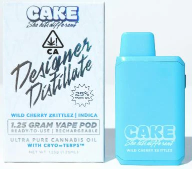 Experience the perfect blend of sweet and tart with Cake Designer Distillate All-In-One Vape in Wild Cherry Zkittlez. This 1.25g vape offers a vibrant flavor profile that captivates the senses, combining warm sweetness with a tingling tartness. From the woman-owned and operated CAKE she hits different brand, this revolutionary product is part of the fastest-growing vape line in California.