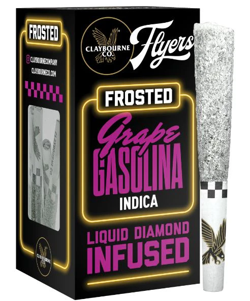 Ride the euphoric wave with Claybourne Infused Flyers Preroll 5pk Grape Gasolina. Rolled with premium, full nug indoor flowers, these potent half-gram pre-rolls come diamond-frosted and are enhanced with aromatic terpenes. They offer a nonstop flavor packed with the sweet burst of grape, intertwined delightfully with spicy notes of fruit and earth. The infused Liquid Diamonds add an extra layer of potency that will keep you relaxed and binge into deep tranquility.