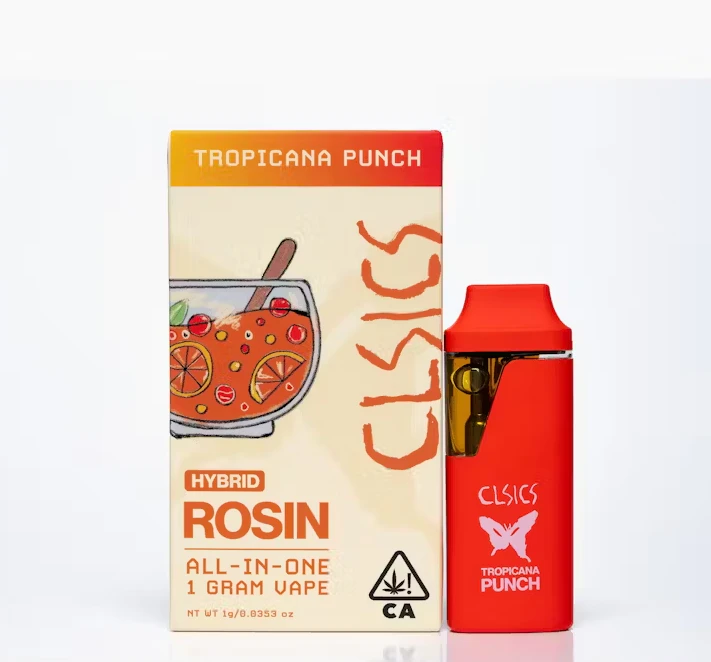Experience the epitome of solventless cannabis excellence with CLSICS Live Rosin All-In-One Vape featuring Tropicana Punch, exclusively available at MMD Shops Marina Del Rey. This masterfully crafted blend marries Tropicana Cookies and Purple Punch genetics, delivering an unparalleled experience that captures the essence of coastal California living.