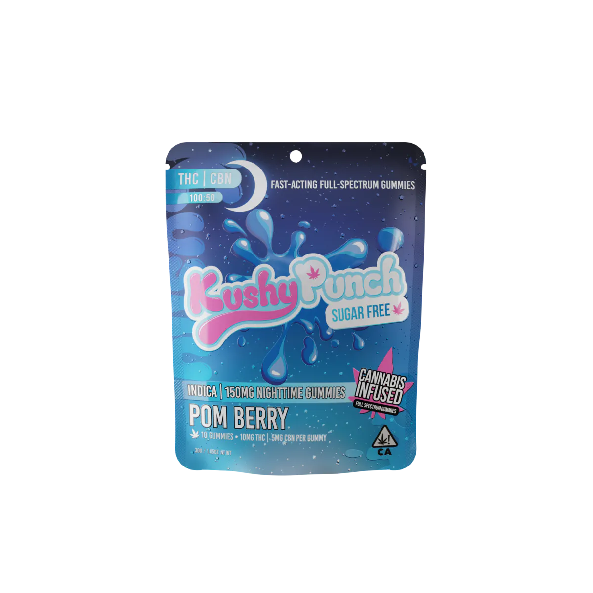 Unwind after a long day with Kushy Punch 10pk Sugar Free Gummies in delicious Pom Berry CBN 2:1, now available at MMD Shops Marina Del Rey. These handcrafted nighttime gummies combine fast-acting, full-spectrum oil to deliver the perfect balance of THC and CBN for ultimate relaxation and legendary sleep.