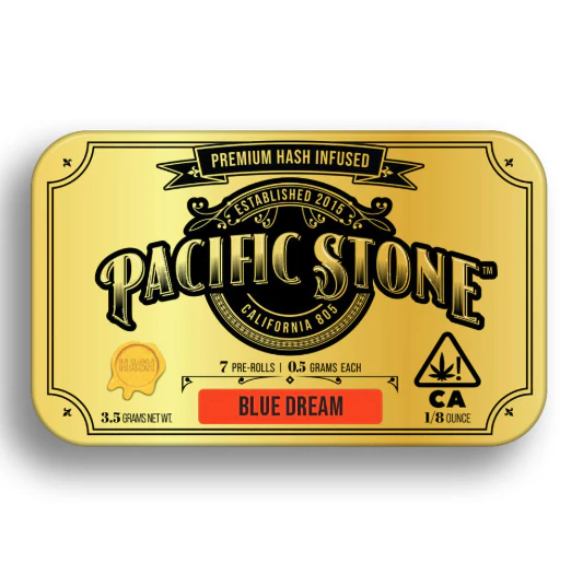Pacific Stone's Blue Dream Hash Infused 7pk Prerolls offer the perfect blend of California's most beloved sativa strain enhanced with premium hash for an elevated cannabis experience. This 3.5g collection features Blue Dream, Pacific Stone's #1 selling strain since 2019, known for delivering a creative, mood-boosting high that appeals to both newcomers and experienced enthusiasts.