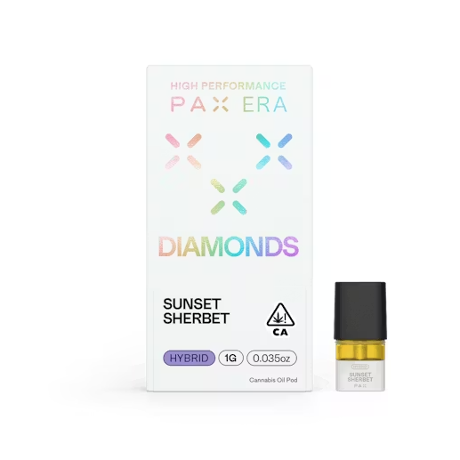 Experience the ultimate in cannabis vaporization with the Pax Era Diamonds Pod 1g Sunset Sherbet from MMD Shops Marina Del Rey. This premium pod delivers the exquisite flavors and effects of Sunset Sherbet, a beloved hybrid strain that combines the best of Girl Scout Cookies and Pink Panties. Known for its full-body relaxation and sweet fruity notes, Sunset Sherbet is the perfect choice for those seeking a laid-back, blissful experience.