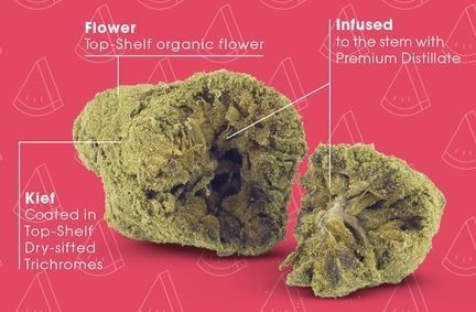 Experience superb potency with the Presidential Moonrock 2g Watermelon. This pristinely presented product encapsulates all the beauty of top-shelf flower, enhanced by its infusion with first-rate THC distillate. Finally, the product is generously blanketed in kief, giving it the intriguing 'moon rock' style of presentation unique to the Presidential brand.