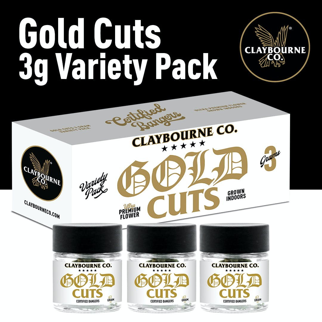 Take in "hit after hit after hit" with a Gold Cuts Variety Pack! Sample three (3) different grams of Claybourne's tried & true, certified bangers! Gold Cuts Variety Packs feature three (3) different strains of 100% indoor grown ultra premium strains. All Gold Cuts strains display a loud nose, high potency, big flavor, and AAA aesthetic. Claybourne Co. does the most to guarantee you tried & true, Certified Bangers!