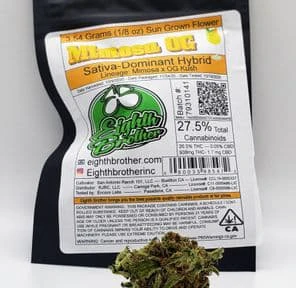 This Mimosa OG enthralls with its light-green spade-shaped colas and luscious sugary resin. Speckled with orange stigmas, it grows into a radiant medium-sized plant. Enjoy farming this flower indoors or outdoors, expecting a flourishing period of around nine weeks. Embark on a refreshing journey with MMD Shops' Eighth Brother 3.5g Mimosa OG, a commendable choice from our flower selections, making your visit to our North Hollywood or Burbank branches worth every mile.