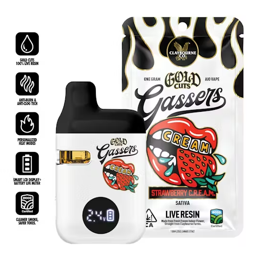 Gold Cuts Live Resin has joined the Gassers 1g AIO lineup. Crafted from strain specific, ultra-premium indoor flower grown at Claybourne Farms and frozen fresh at harvest to lock in the plant’s natural terpene and cannabinoid profile. True-to-strain live resin built for flavor, potency, and the same reliable all-in-one performance you expect from Gassers. Always on the gas.