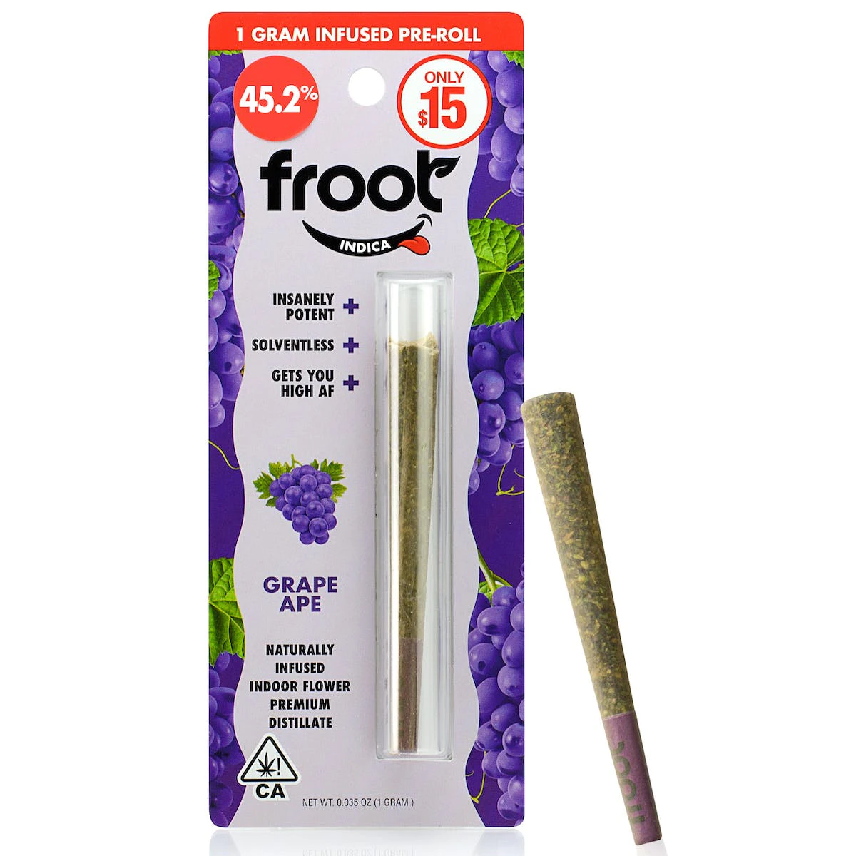 Indulge in the highest quality with MMD Shops Redwood City Froot Infused 1g Preroll Grape Ape. Each Froot Infused Preroll is born out of the best plants earth has to offer, ensuring a top-tier product and experience for our discerning customers. This infusion of exceptional cannabis and cannabis oil pushes the boundaries, creating a profoundly smooth, pleasurable, and flavorsome smoking experience. The Grape Ape version of Froot Infused 1g preroll promises a long-lasting, flavor-loaded journey that sets you up for the ultimate indulgence, whether it's daytime, nighttime, or any time in between. Crafted using 100% indoor flower, every preroll steps up to the plate with unmatched flavor and consistency, pledge to the unwavering standards we've cultivated in Redwood City dispensary scenes. This approach ensures our prerolls not only meet but also exceed the expectations of even the most seasoned cannabis connoisseurs. So, no matter when you want to treat yourself, always remember – there's never a bad time to Enjoy Froot! Elevate your cannabis experience with these naturally infused Prerolls from Froot, exclusively available at MMD Shops in Redwood City. Feel the difference the best plants in the world can make in every puff.