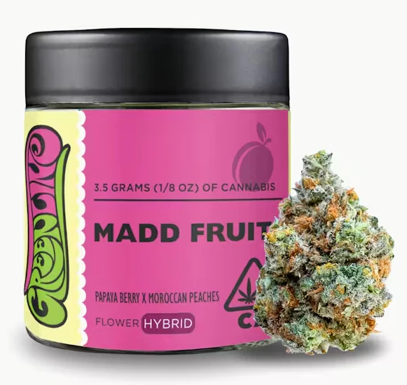 Madd Fruit is an indica-dominant hybrid bred by Purple City Genetics. A cross of Papaya Berry Runtz x Moroccan Peaches, this strain bursts with exotic fruit flavor and delivers a deeply relaxing, full-bodied high.