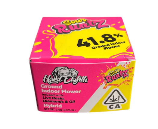 Hard Eighth Sour Runtz is a high-potency, infused cannabis product containing 3.5 grams of indoor ground flower combined with live rosin, diamonds and oil. A cross between Runtz and Sour Diesel, resulting in a 70% indica-dominant hybrid. Characterized by a sweet-and-sour profile with notes of citrus, lemon-lime, melon, and fruity candy.