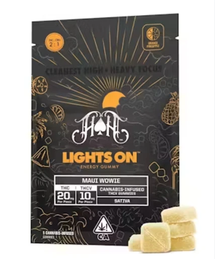 Lights On Gummies are formulated to deliver a clean, relaxing high without the heaviness. A bright blast of juicy pineapple and zesty orange, bursting with tropical sweetness and citrus tang. Infused with Maui Wowie, a legendary sativa known for its uplifting island vibes and vibrant citrus flavor, amplified with THCV, a promising rare cannabinoid which may produce a less hungry high.