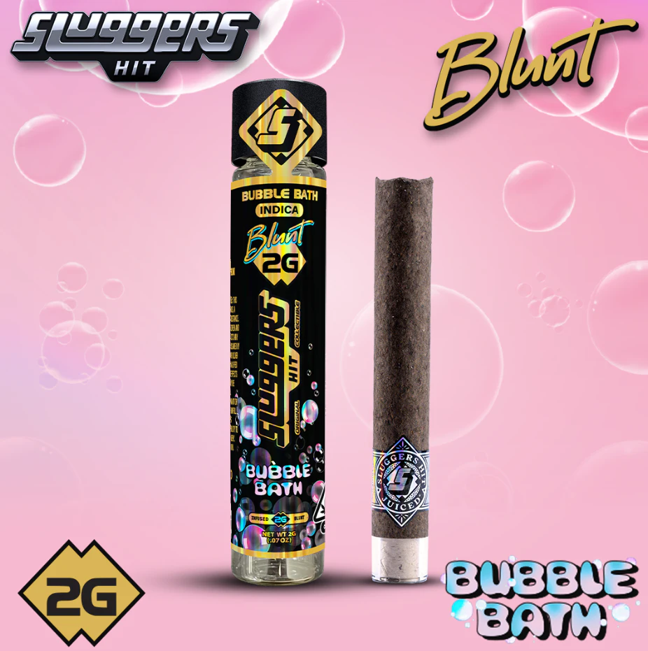 This 2 gram infused blunt, brought to you by Sluggers Hit, is filled with premium, single source inputs - Whole ground flower, infused with solventless hash and diamonds - rolled in a hemp wrap with a glass corn husk filter.